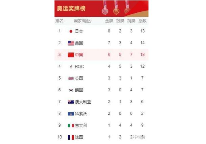 以下是2020年东京奥运会奖牌榜的最新排名: