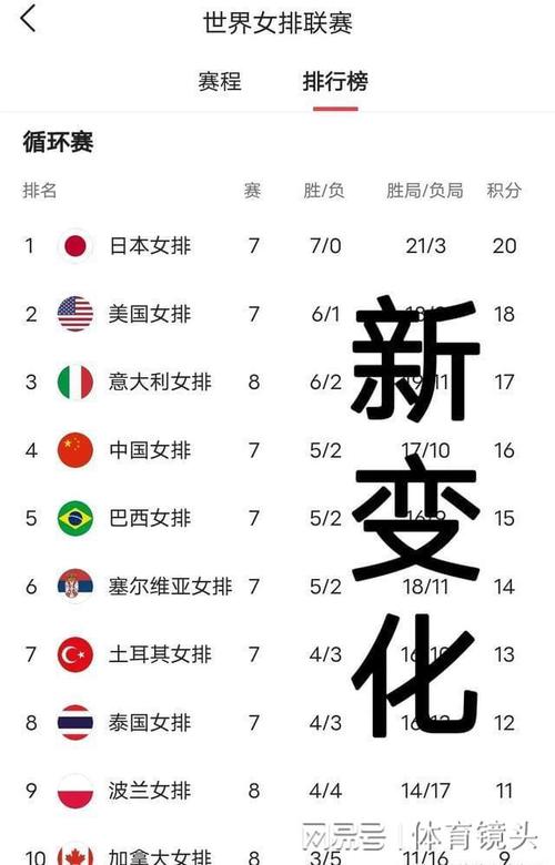 这个排名表展示了当前世界女排联赛的强队,但请注意,排名是动态变化的,将根据球队的最新表现进行更新。女排联赛中的竞争非常激烈,每支球队都在不断努力提高实力,并且在比赛中有时会出现一些意外结果。