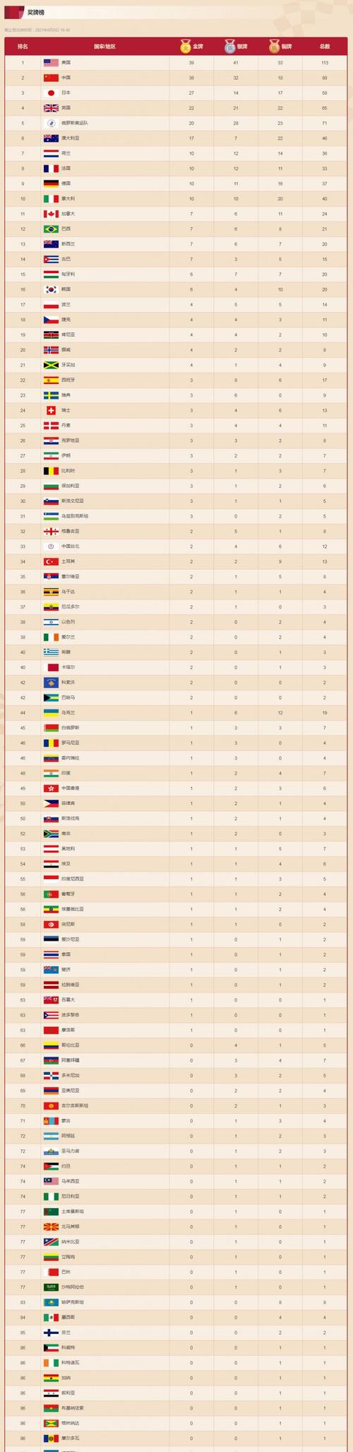 1. 美国:总计76枚奖牌(40金,19银,17铜)