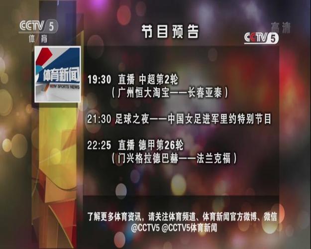 根据CCTV5的节目安排,今日的节目主要包括以下内容: