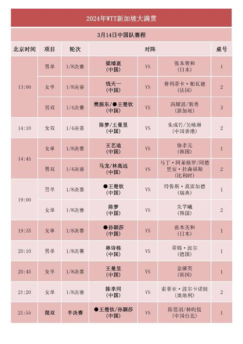 不同赛事的赛程和安排会有所不同,具体的详细信息可以通过国际乒乓球联合会(ITTF)官方网站或相关赛事官方网站获取。